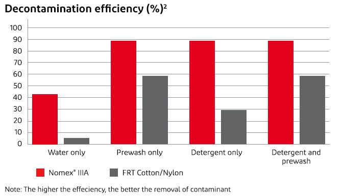 Anche se nessun indumento ignifugo deve essere utilizzato quando è contaminato da materiale infiammabile, i materiali sintetici come Nomex® espellono lo sporco più facilmente degli indumenti ignifughi in cotone.2