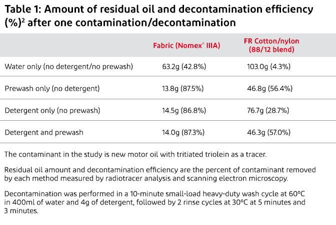Si è concluso che la fibra Nomex® trattiene la quantità minore di contaminanti, mentre la fibra di cotone/nylon ignifugo ne trattiene la quantità maggiore. Poiché l'olio e altri contaminanti si depositano sulla superficie e non penetrano nelle fibre sintetiche come Nomex®, possono essere rimossi più facilmente.2